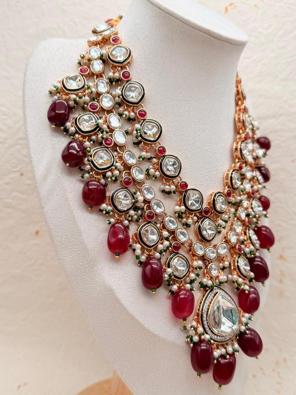 Drenched in the depth of royal maroon, the Rudhroopika Kundan Replica Bridal Set is a poetic celebration of passion and power. Its rich hues, detailed craftsmanship, and bold Kundan embellishments reflect the spirit of a queen who reigns with both strength and elegance. Designed to make every heartbeat royal.