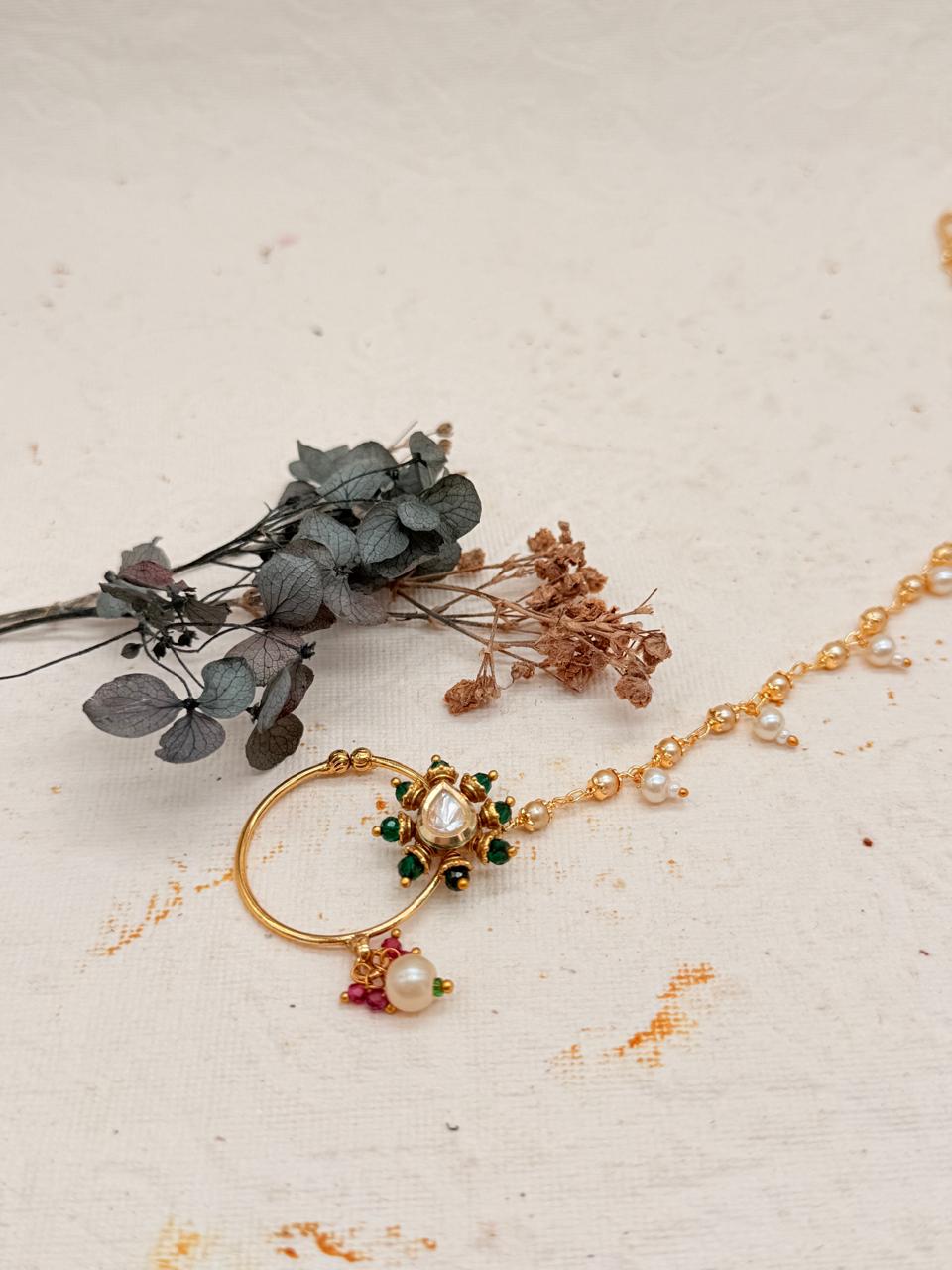 Set includes: Statement Necklace, Sheeshpatti, Nath, 2 Adjustable Rings, Earrings With Kaanchain.