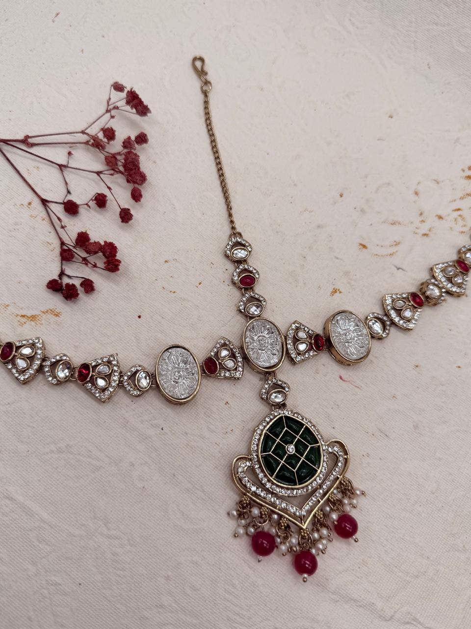 Best paired with deep-toned bridal lehengas — emerald, maroon, ivory, or gold — or with regal silk sarees. The contrast of red and green complements both traditional and heritage wedding ensembles beautifully.