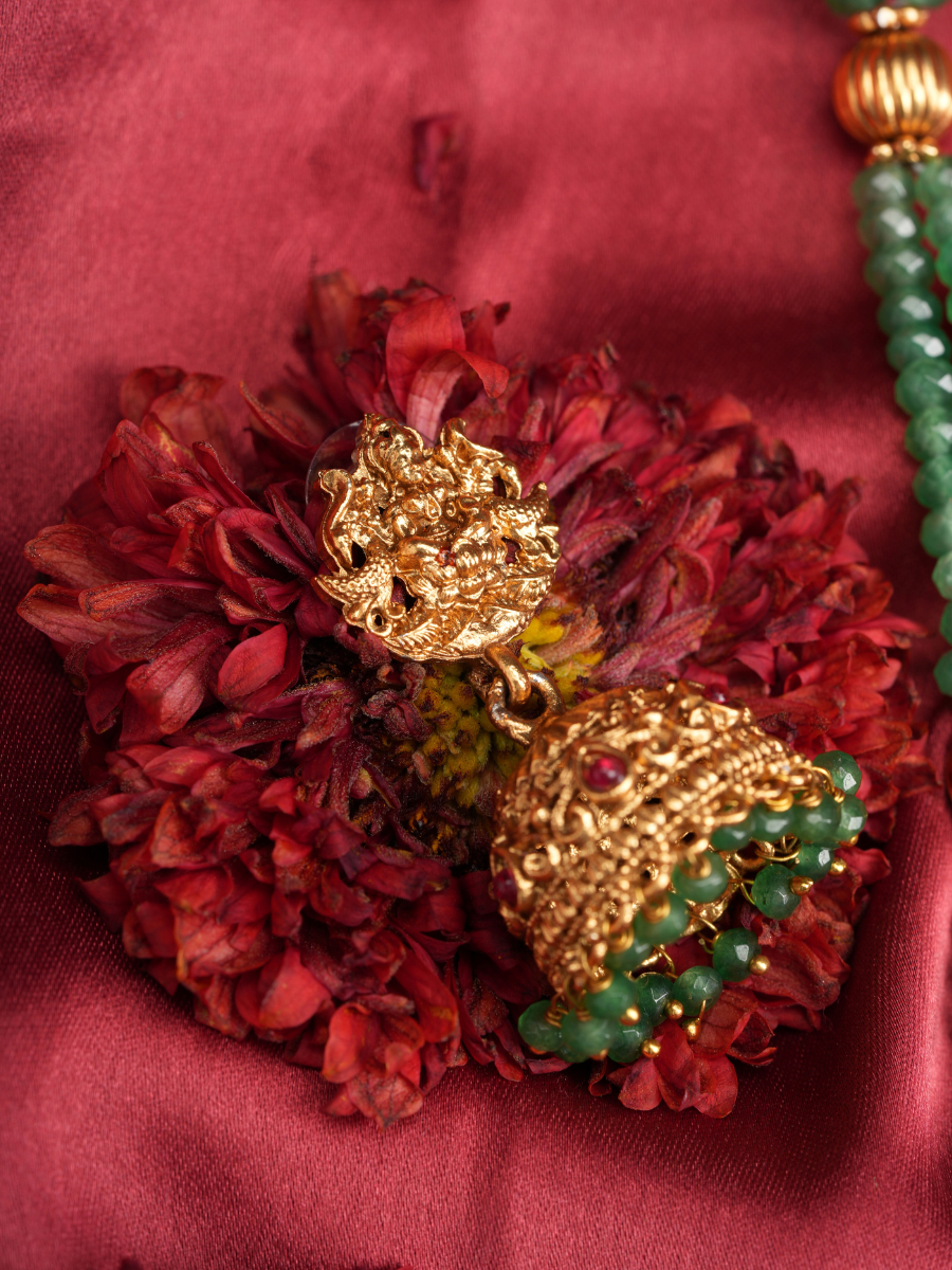 An opulent temple haar featuring Goddess Lakshmi seated gracefully on a lotus, sheltered within a sculpted canopy and adorned with an exquisite peacock motif. Embellished with green beads, pearls, and intricate detailing, this masterpiece reflects prosperity, beauty, and divine protection. Perfect for brides, festive occasions, and traditional ceremonies, it embodies timeless grandeur.