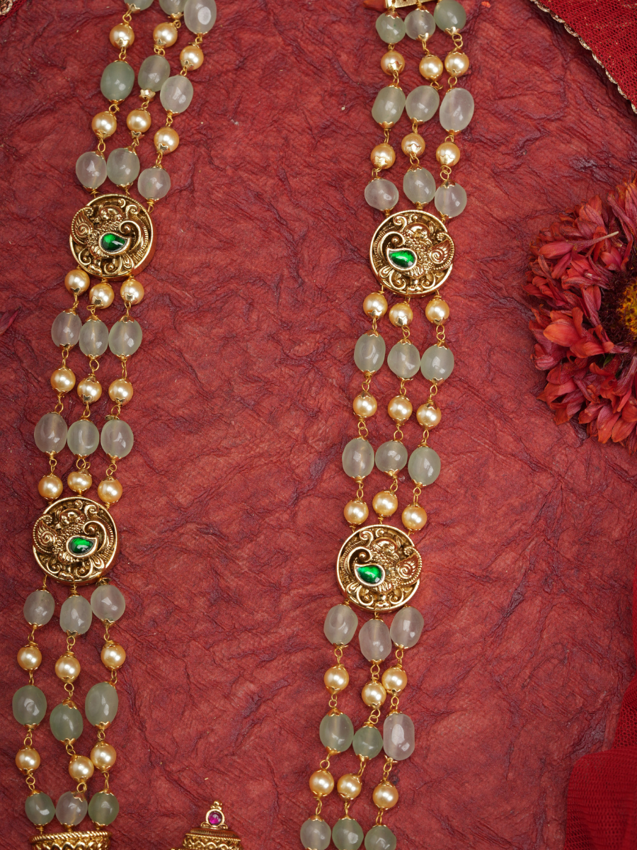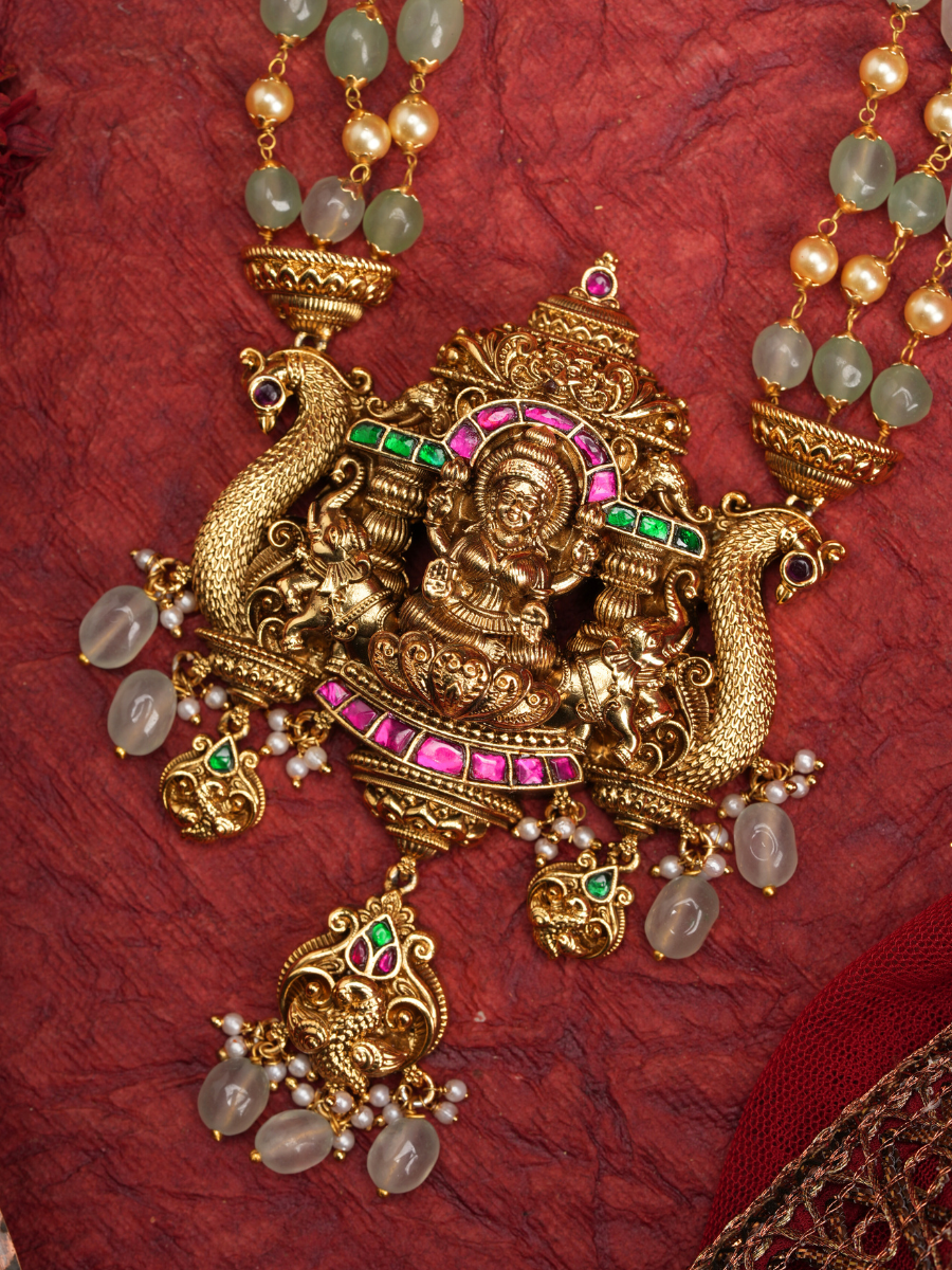 Amrita Lakshmi Haar – A divine temple necklace featuring Goddess Lakshmi, yali motifs, and pastel green beads, paired with matching jhumkas. Perfect for weddings & festivals..