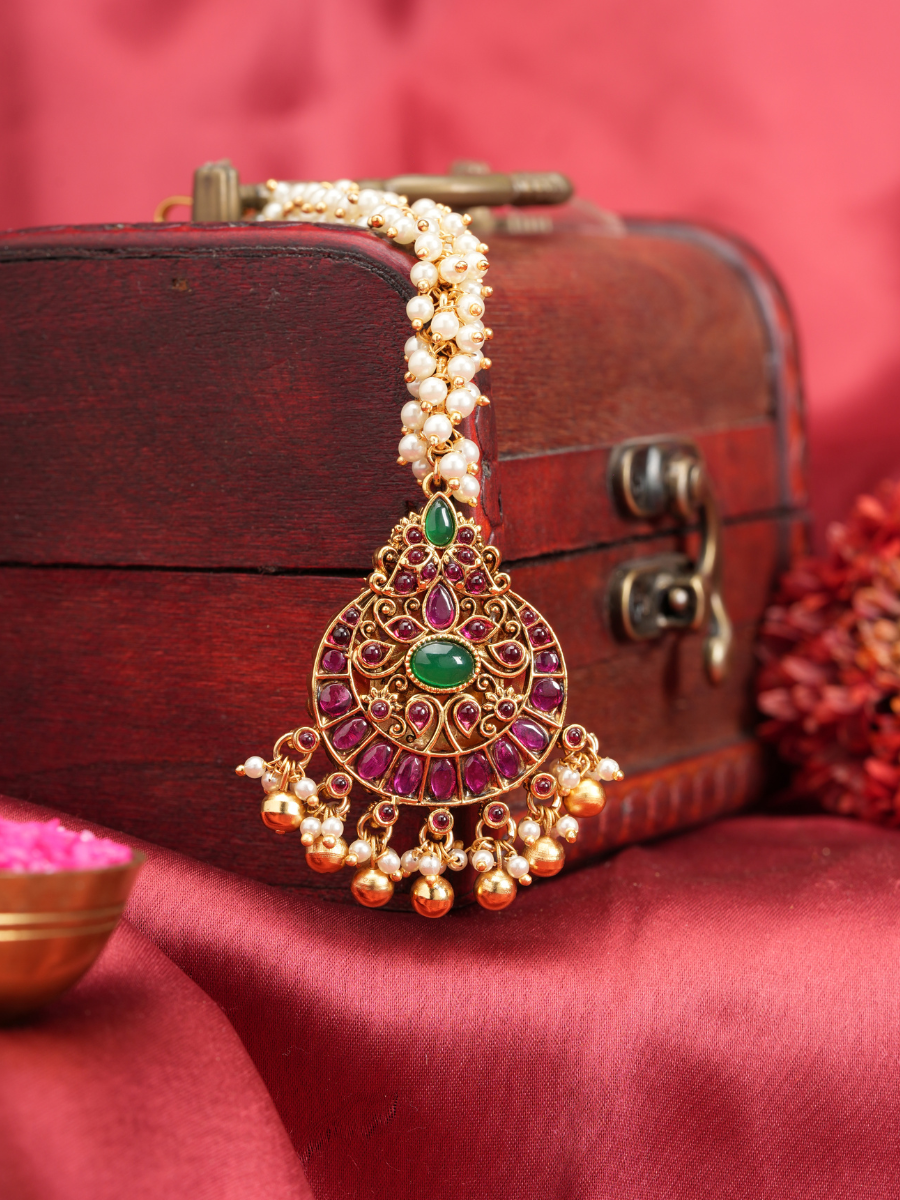 Adorn yourself with the radiant aura of Shubhra Kirti, where sacred tradition meets timeless artistry. Crafted with vibrant ruby and emerald-toned jadau stones, this temple-style maang tikka features a grand crescent design, highlighted with intricate patterns and classic pearl clusters.