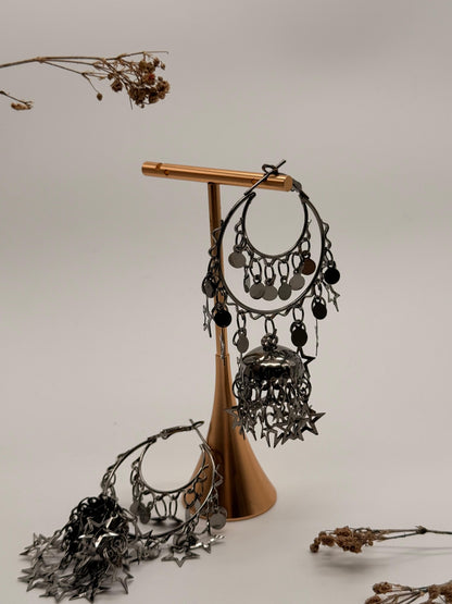 Elevate any look with the Celestial Cascade earrings, designed in an Indo-Western fusion style. These statement earrings are lightweight, ideal for all-day comfort. Each piece features an elaborate hoop structure adorned with metallic discs and star-shaped charms, evoking a sense of night-sky glamour. The dynamic layers create graceful movement, making these earrings perfect for casual outings, music festivals, or adding celestial sparkle to cocktail evenings. Their versatile tone pairs effortlessly with both ethnic wear and modern outfits, from sarees and kurtis to maxi dresses and jumpsuits.
