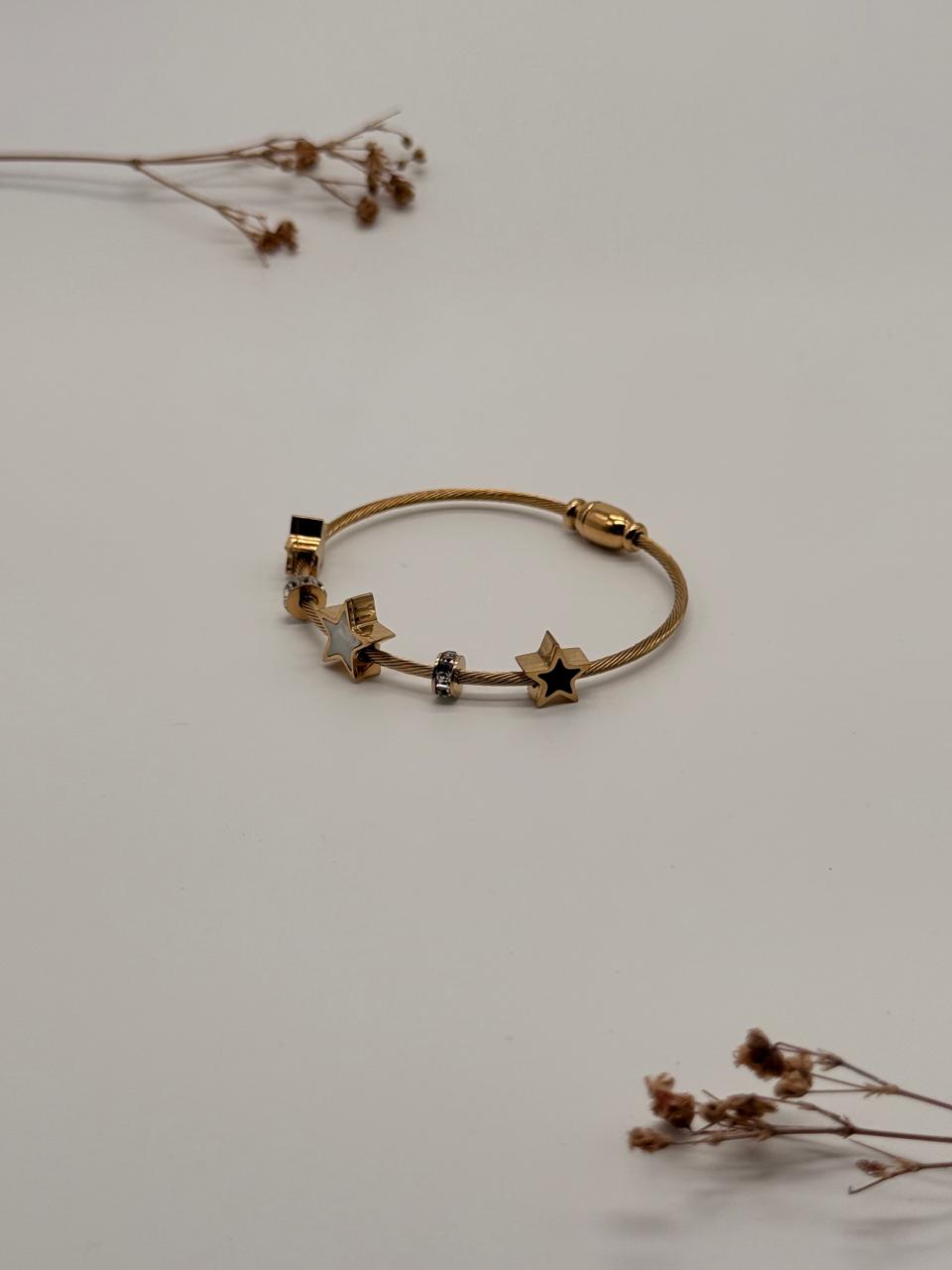 Turn everyday moments into cosmic statements with Stargleam. Featuring a stunning gold cable band adorned with a central mother-of-pearl star, flanked by sparkling crystal spacers and black enamel star charms, this bracelet feels like a constellation wrapped around your wrist. Lightweight, anti-tarnish, and made with 316L stainless steel, it’s skin-friendly and crafted for everyday magic — whether you're at work or out under the stars.