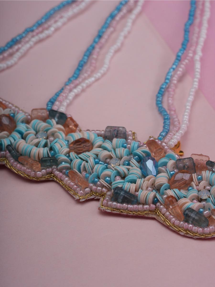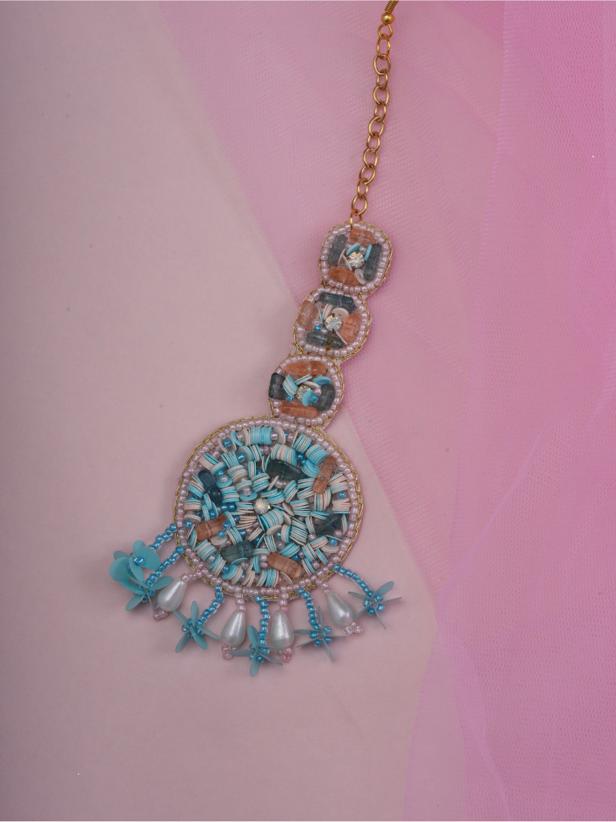 Each piece showcases a rich combination of turquoise and white beads, lustrous pearls, and gold-toned embellishments. The thoughtful design allows movement and sparkle, making it ideal for weddings, festive occasions, or classical dance performances. Set against a pink backdrop, the colors radiate warmth and regality, perfect for bridal wear or heirloom gifting.