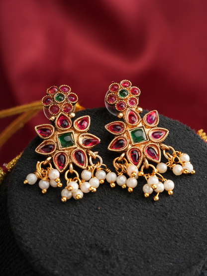 Ratnaprabha Lakshmi Mangala Haaram Set is a regal temple-style jewelry ensemble featuring intricately crafted Lakshmi motifs, radiant gem embellishments, and delicate pearl accents, symbolizing prosperity and auspiciousness.