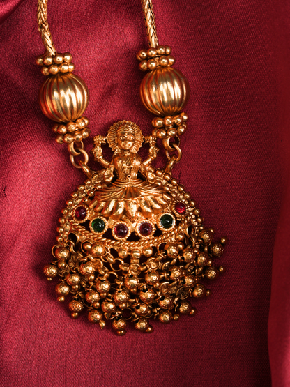 Adorned with clusters of gold beads and goddess motifs, this Guttapusalu Temple Mala is an exquisite example of traditional craftsmanship, perfect for adding a touch of royal heritage to any ensemble. It pairs beautifully with silk sarees, Kanjeevarams, and lehengas, making it a favored choice for weddings, festive celebrations, classical dance performances, and auspicious occasions.