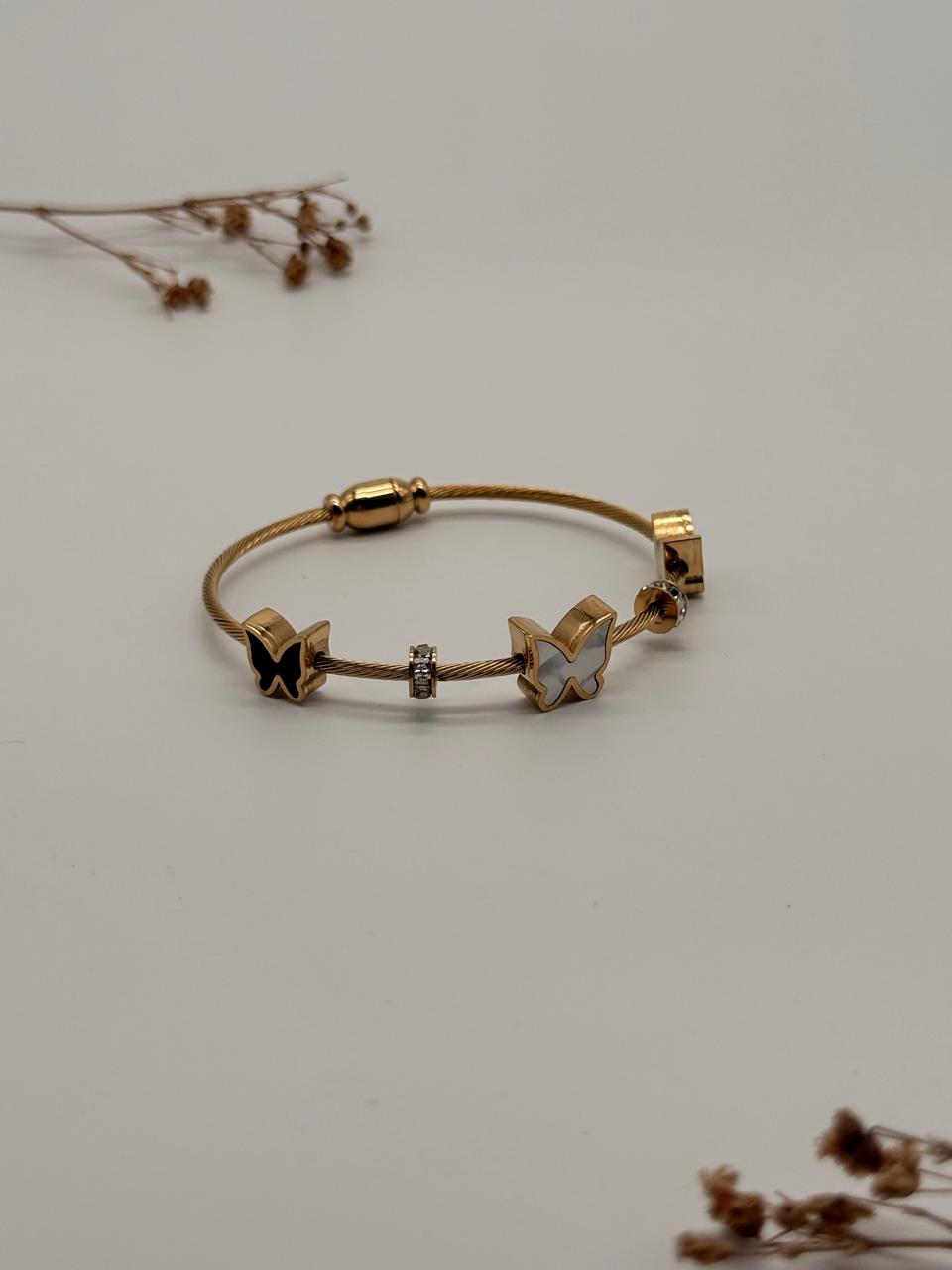 Let your style take flight with Whimsy Wing, a delicate bracelet that captures the beauty of transformation. Featuring a lustrous mother-of-pearl butterfly charm flanked by sparkling crystal-studded rings and metallic accents, this bracelet brings elegance with a free-spirited twist. The gold-toned twisted cable base, made from 316L stainless steel, ensures it's anti-tarnish, hypoallergenic, and durable — perfect for everyday magic. Feminine, ethereal, and eye-catching, Whimsy Wing is made to flutter gracefully on your wrist.