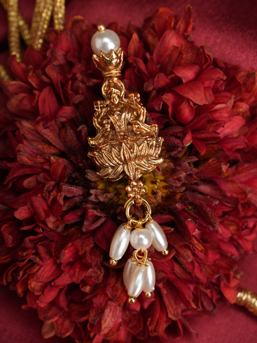 Embellished with prosperity, this handcrafted temple necklace features Goddess Lakshmi with intricate detailing and pearls. Perfect for brides, festive sarees, cultural functions, and classical dance performances.