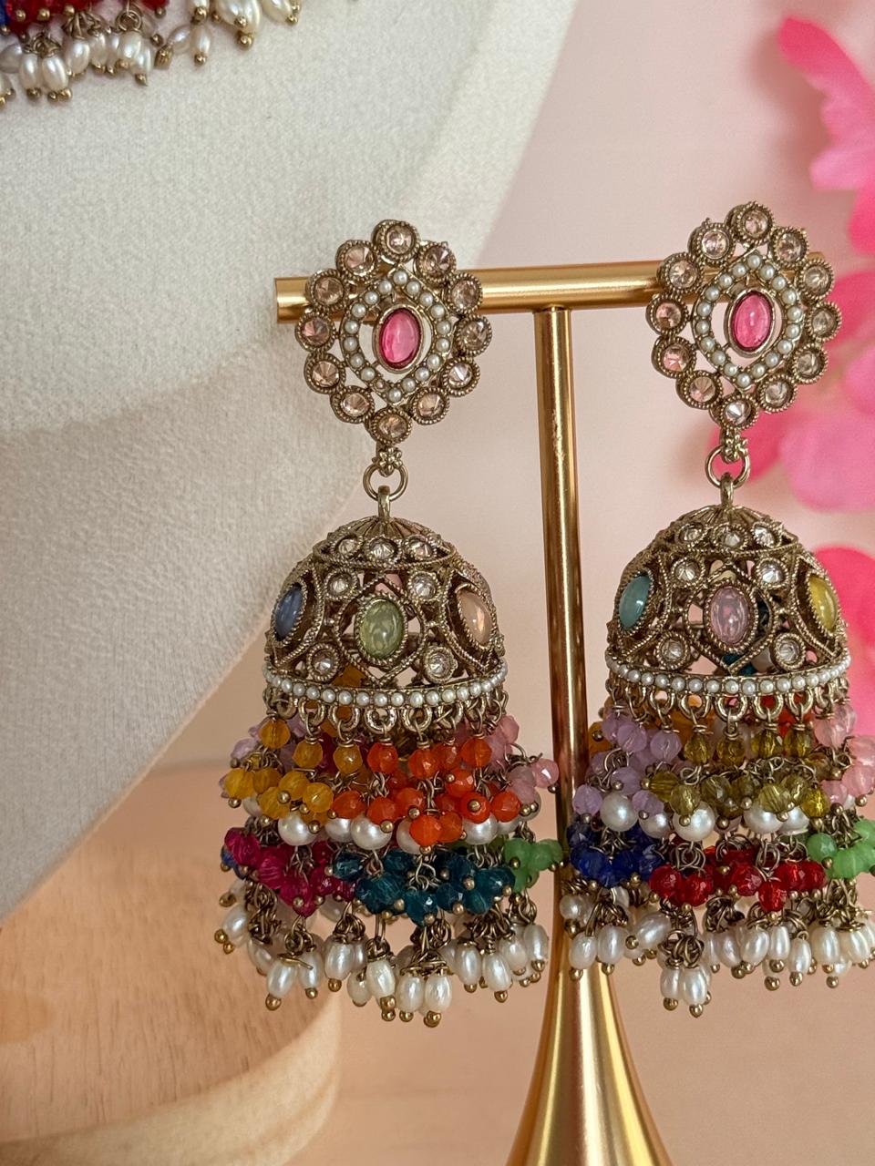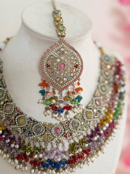 This set complements traditional bridal attire such as richly embroidered lehengas, sarees, and anarkalis in bright and lively colors, enhancing the overall grandeur and festive elegance.